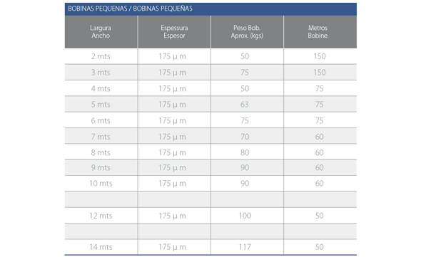 As espessuras standard poderão variar de 150 μ m a 250 μ m